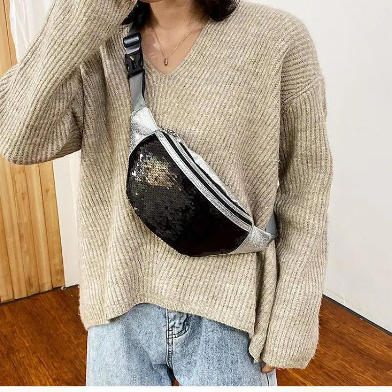 This stylish fanny pack features sequin design and an adjustable belt, perfect for women and girls to carry essentials while on the go.