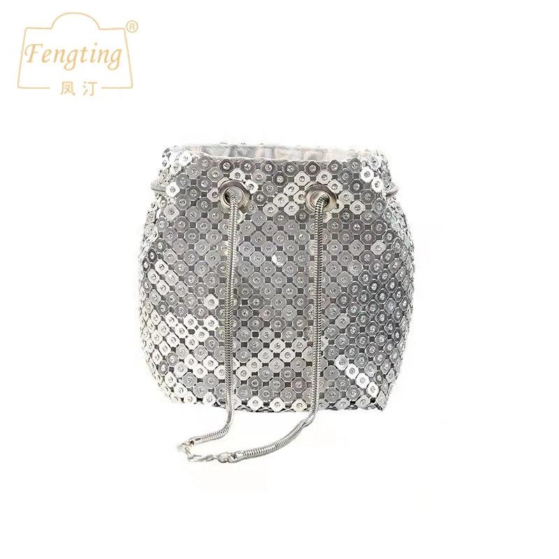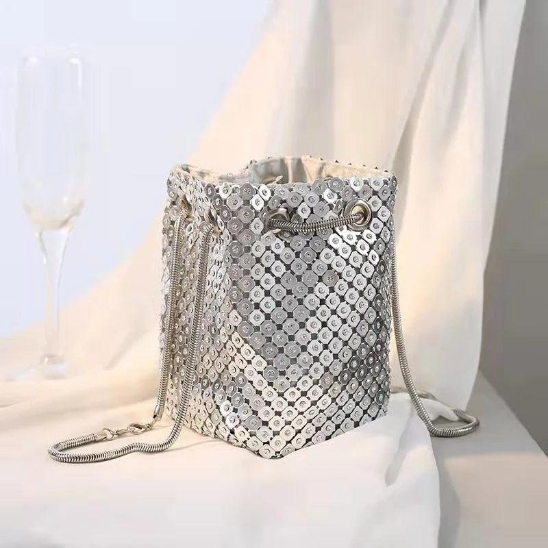 This silver metal sequins chain woven bag is perfect for evenings out or holiday travels. It is a stylish shoulder bag that adds a touch of elegance to your outfit.