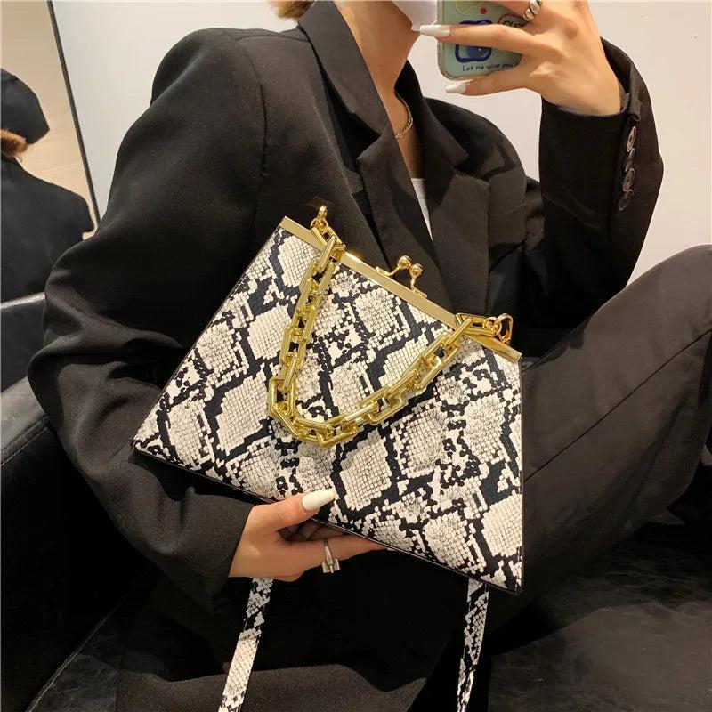 Elevate your style with this chic serpentine crossbody bag featuring a thick chain strap. Perfect for any occasion!