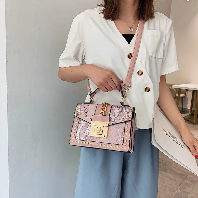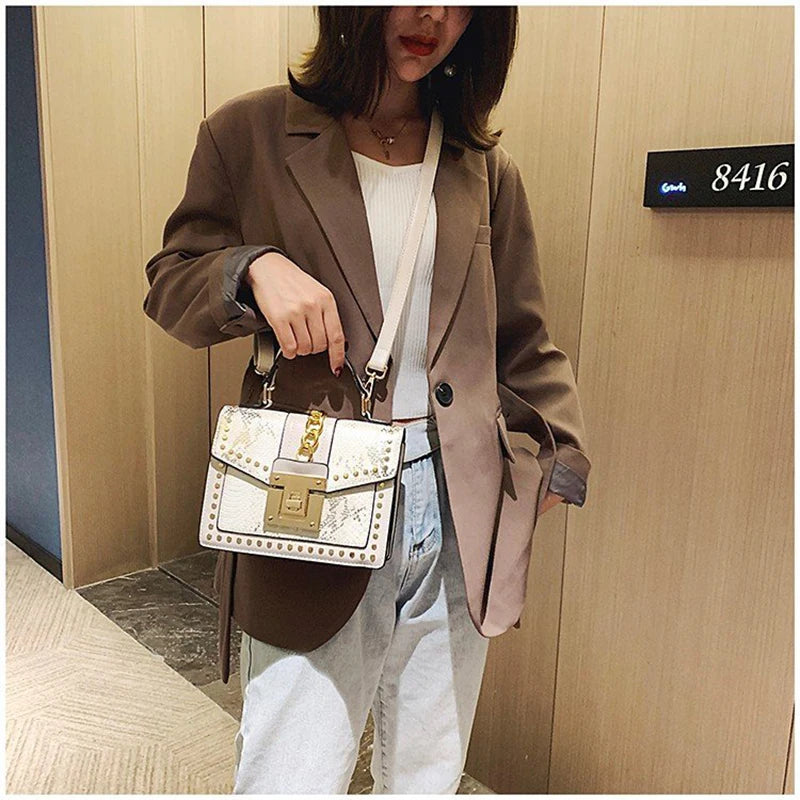 Elevate your style with this chic serpentine crossbody bag, featuring a snakeskin design and a rivet lock closure. Perfect for any occasion.