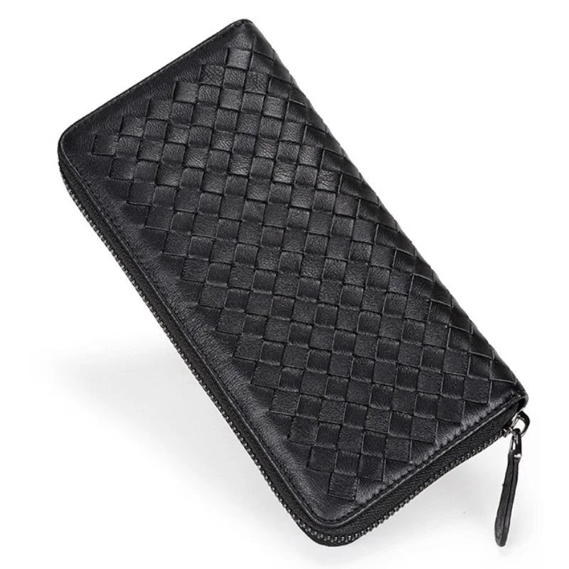 Keep your essentials organized in style with this sheepskin knitting leather wallet. Features coin purse, card holder, and a cell phone pocket for added convenience.
