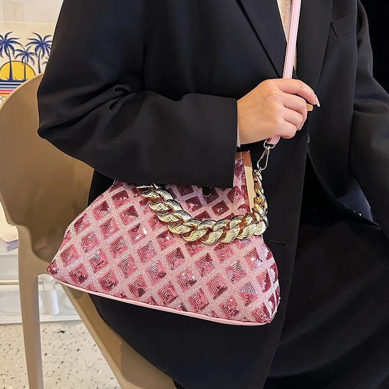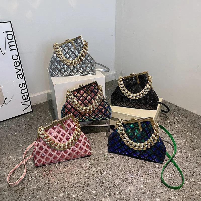 This stylish women's bag features a thick chain handle and a shell design, perfect for everyday use. Can be worn as a clutch, crossbody bag, or handbag.