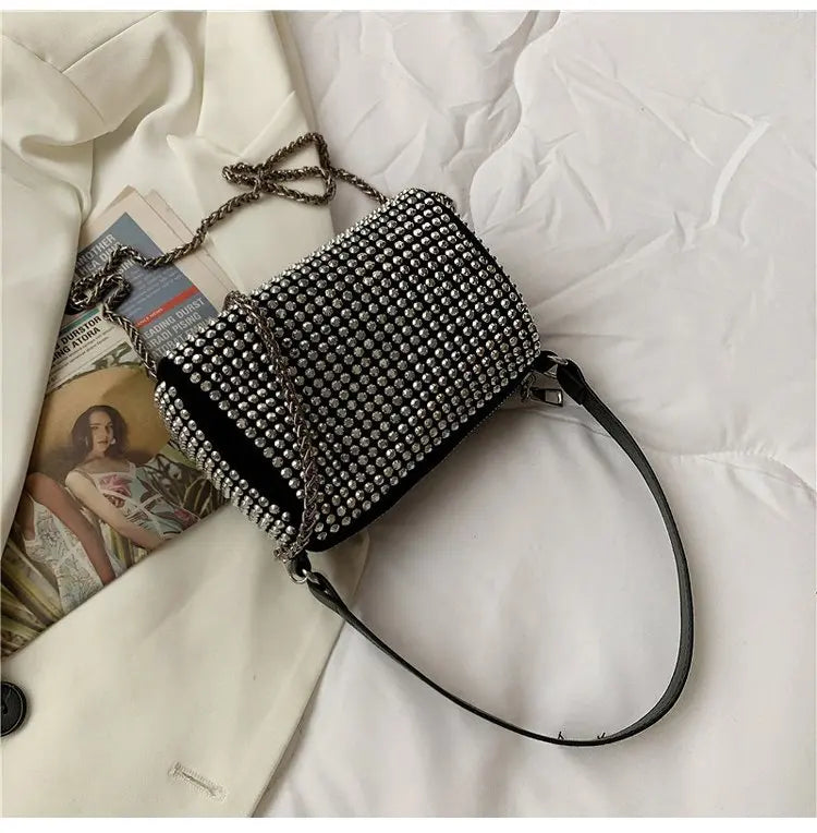 This punk style handbag features a silver design with diamonds and rhinestones, perfect for adding a touch of glam to any outfit.