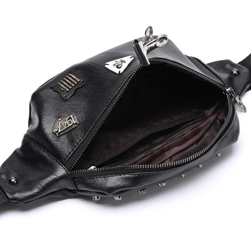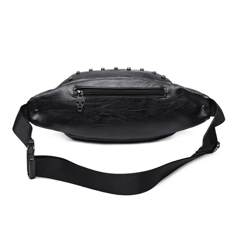 This stylish fanny pack is designed with skull rivet details, making it a fashionable accessory for both men and women. It can be worn around the waist or as a shoulder pouch.