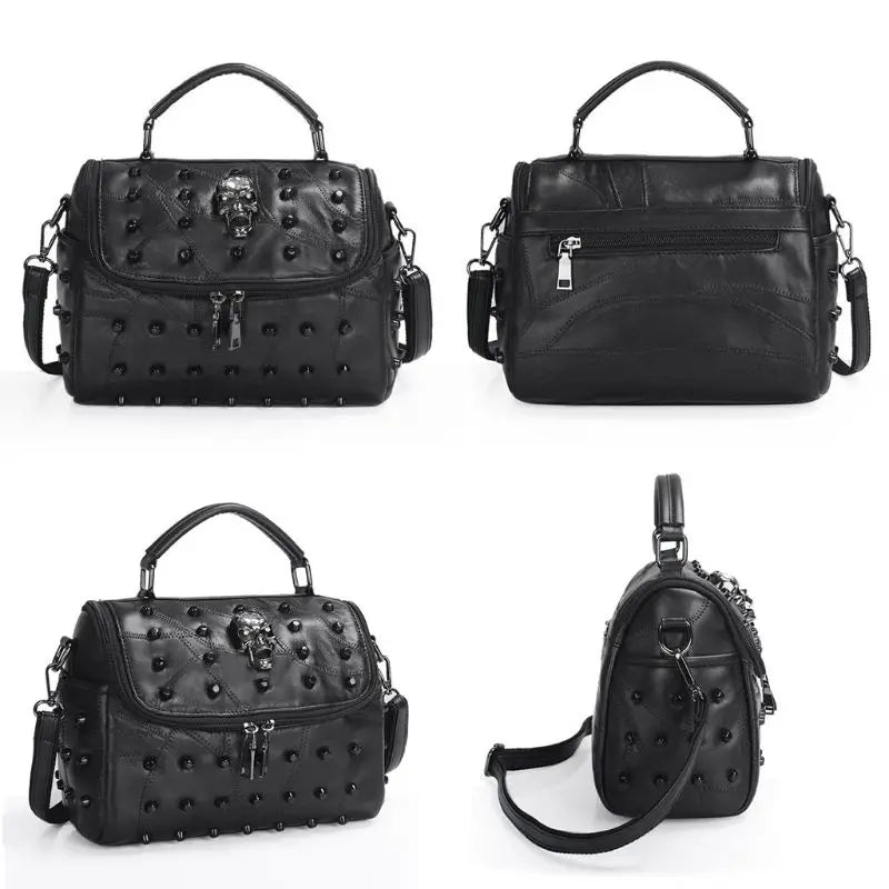 This women's handbag is crafted from high-quality split sheep leather, making it durable and stylish. It features a skull design, making it a unique and edgy accessory for everyday use or travel.