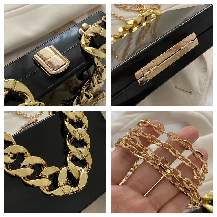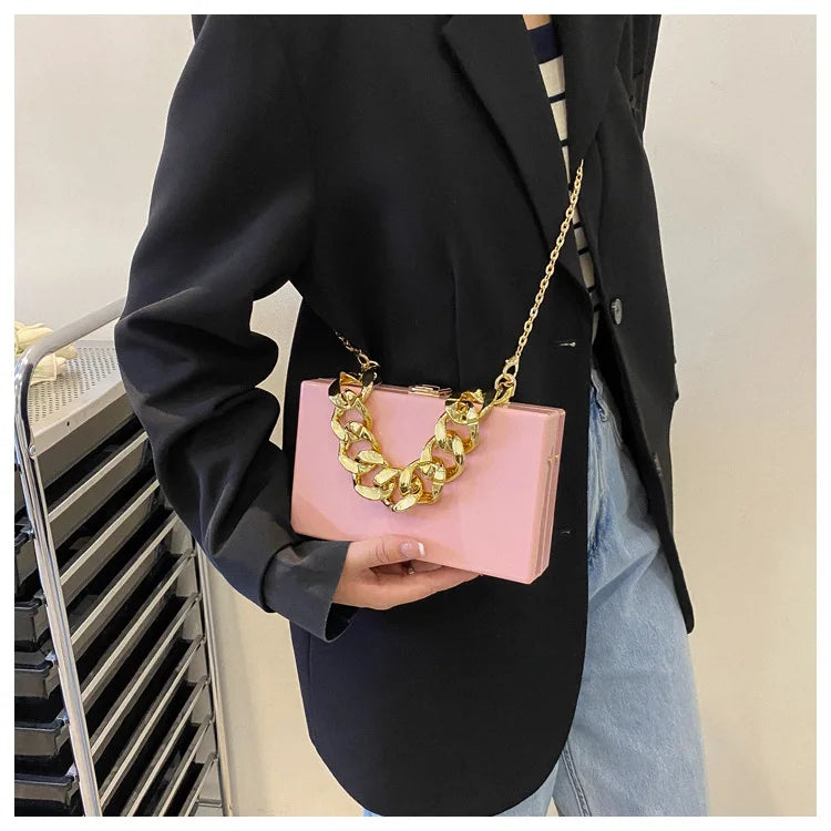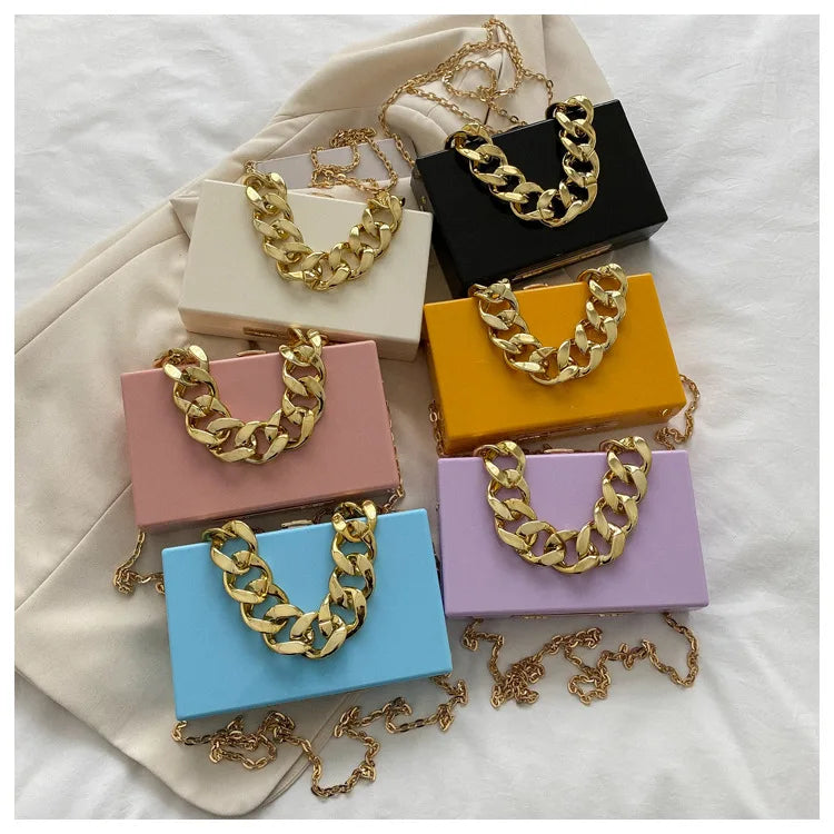 Elegant and stylish small box shoulder bag featuring a thick chain strap made of acrylic PVC. Perfect for parties, evenings out, and as a crossbody clutch.