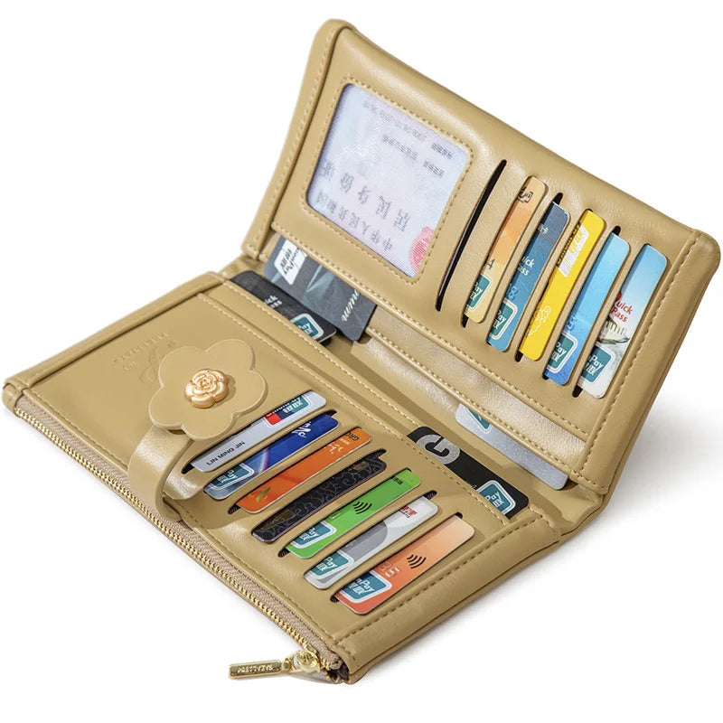 This long wallet features a small fresh flower buckle design. It is made of high-quality PU material and comes in a two-fold style.