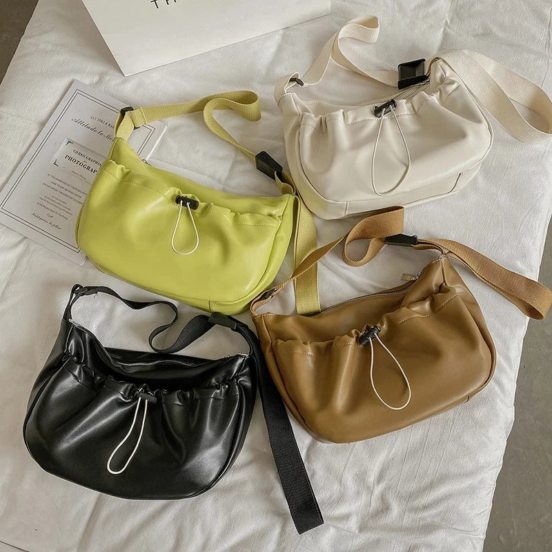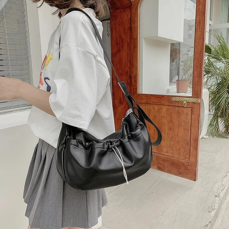 Stay trendy with this drawstring shoulder bag made of high-quality PU leather for summer outings.