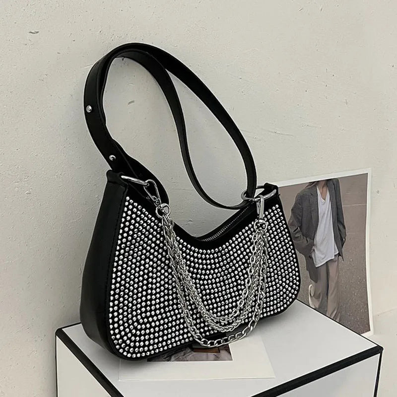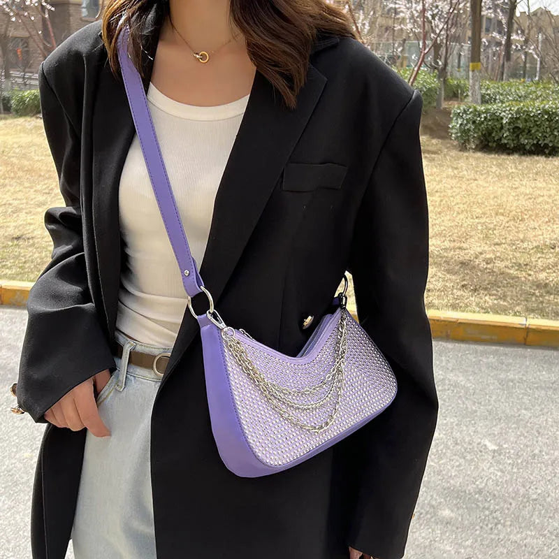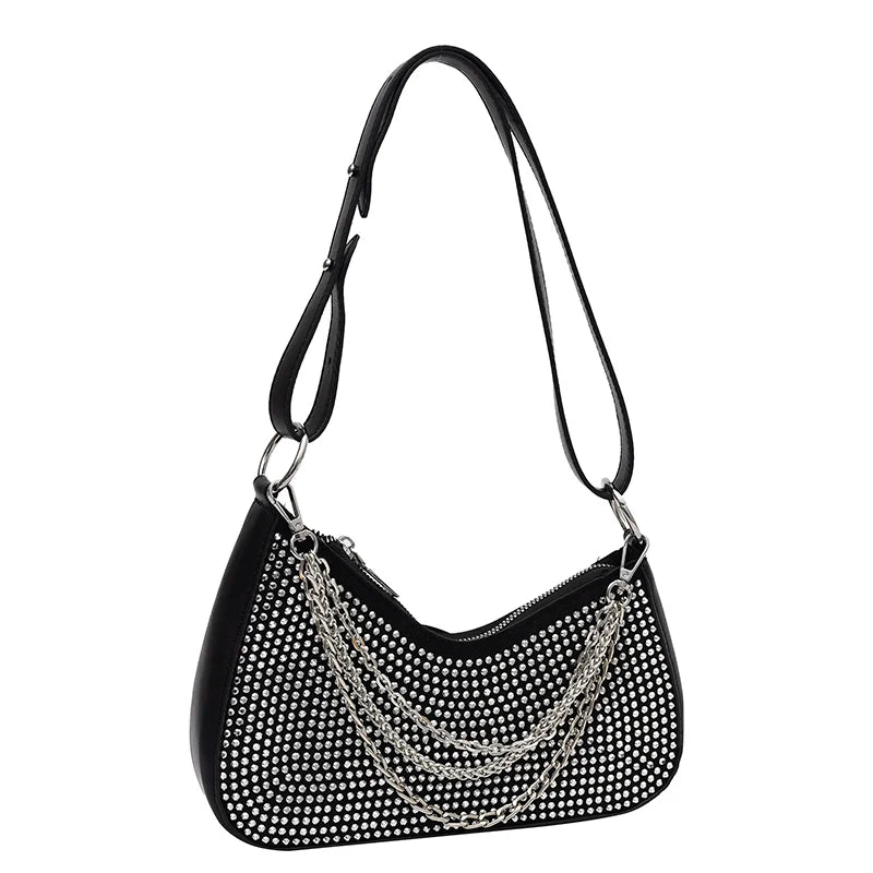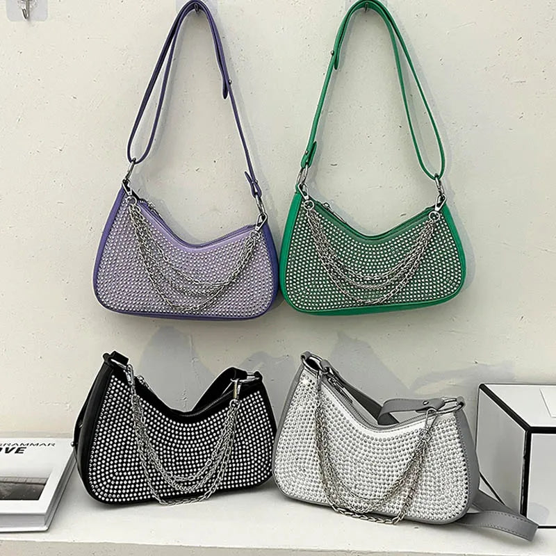 This stylish and elegant small crossbody sling bag is adorned with rhinestones, perfect for summer outings, parties, and evening events. It is a fashionable underarm bag that adds glamour to your look.