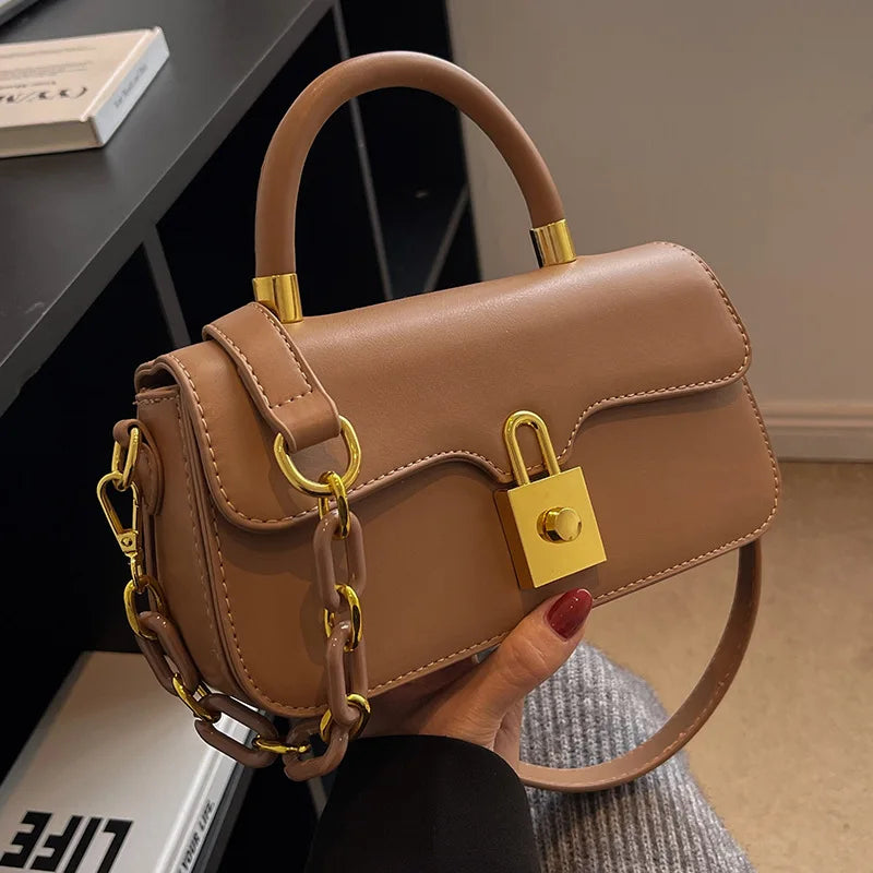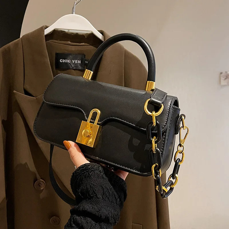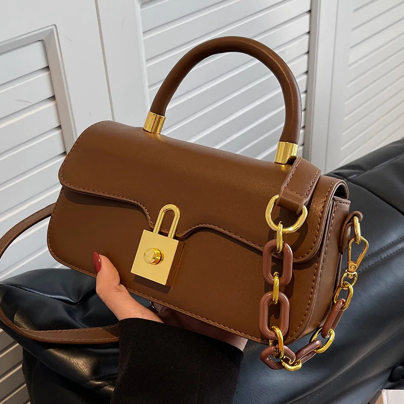 This stylish small square handbag is made of high-quality PU leather with a metal button closure. It can be worn as a crossbody bag and features a shoulder strap.