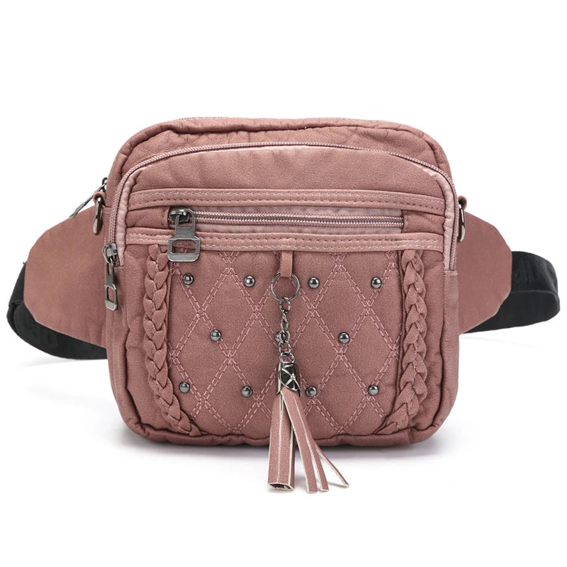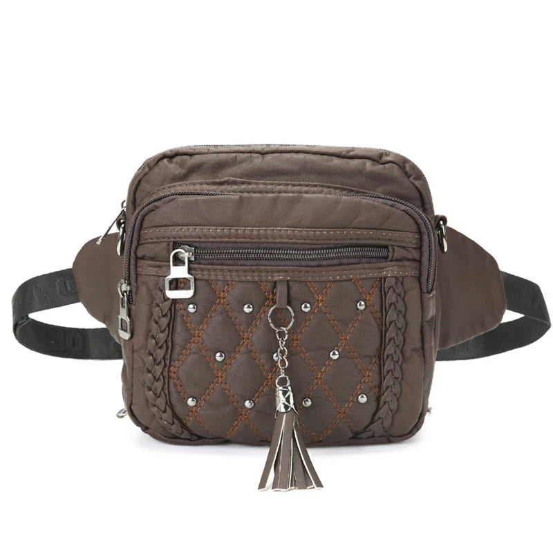 This small women's bag is made of PU leather and features 2 functional pockets, tassel design, and can be worn as a waist bag or shoulder bag.