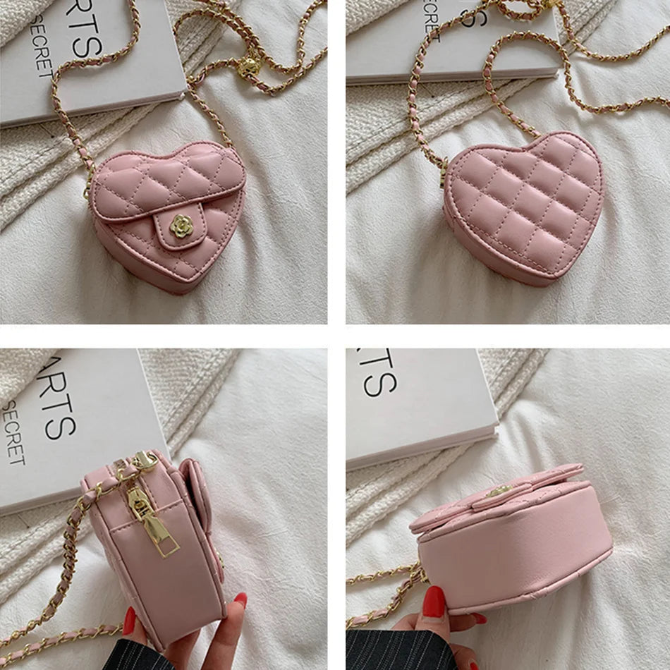 This small shoulder crossbody bag is made of PU leather and features a quilted design. It has a heart shape and includes a chain strap. Perfect for children to carry their essentials in style.