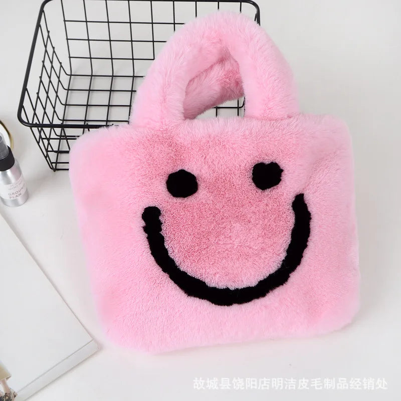 This adorable shoulder bag features a smiley face design on soft faux fur material. The perfect accessory for adding a fun touch to your outfit.