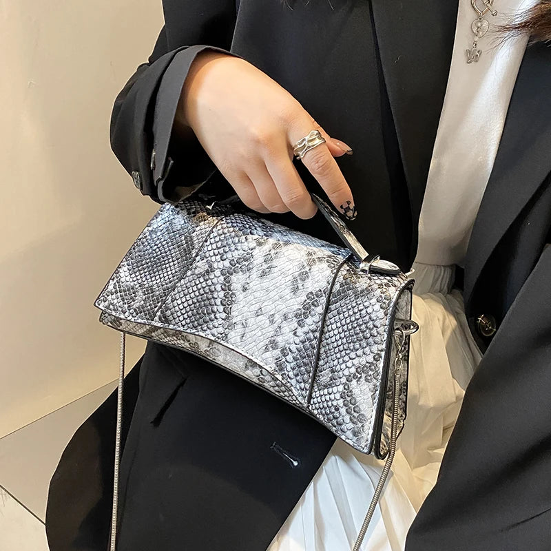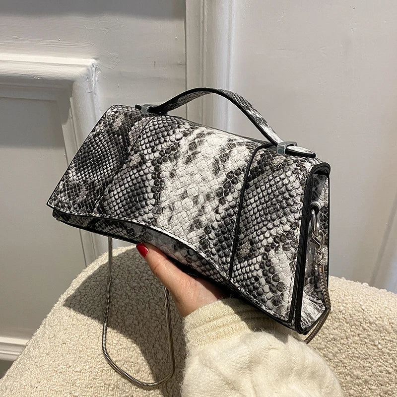 Stay stylish with this snake pattern women handbag that features a chain strap and is highly portable.