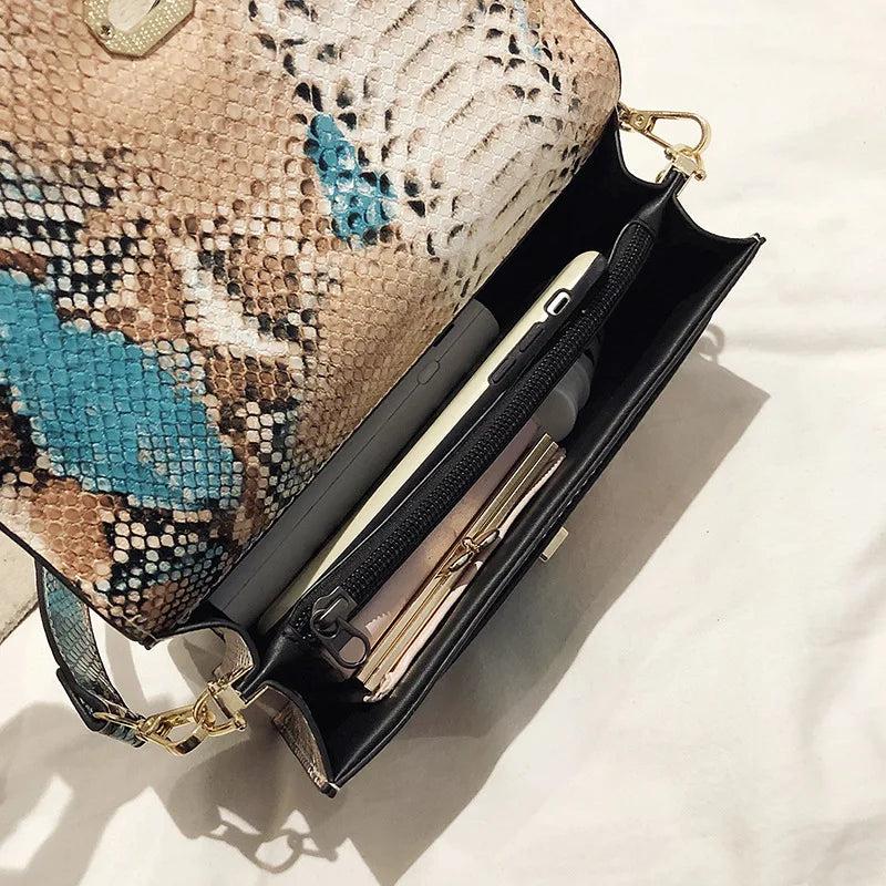 Elevate your style with this trendy snake pattern flap bag made of high-quality PU leather. Featuring a wide strap, this bag is perfect for everyday use.