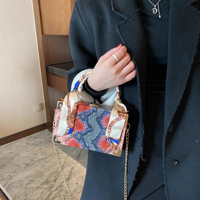 Elevate your look with this stylish snakeskin box style purse. Perfect for parties and special occasions, this bag features a chain shoulder strap and top handle for versatile carrying options.
