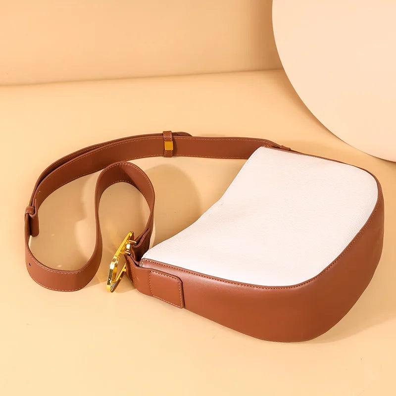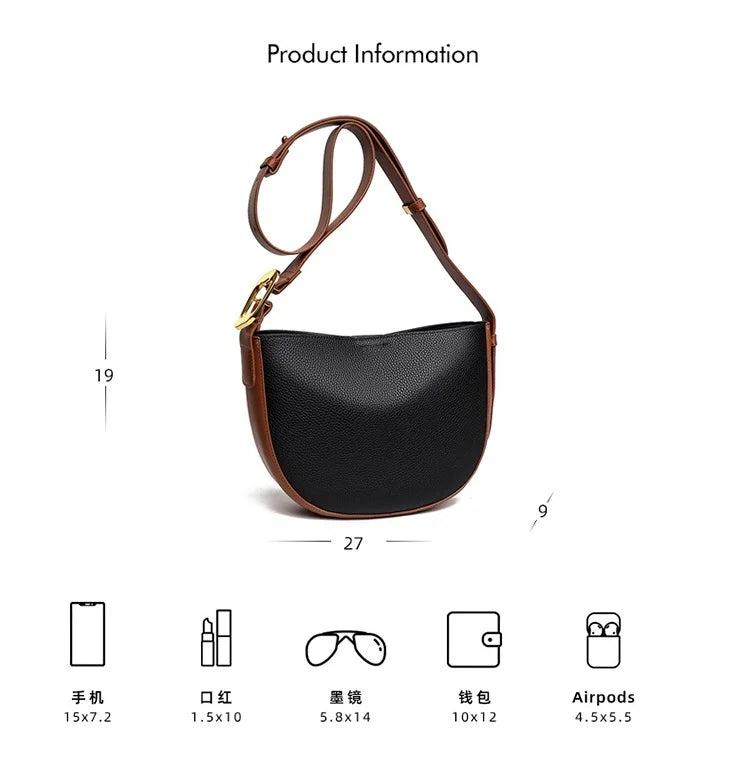 This stylish saddle crossbody bag is made of high-quality cowhide leather, perfect for everyday use. It features a small size ideal for carrying essentials, and a comfortable shoulder strap.