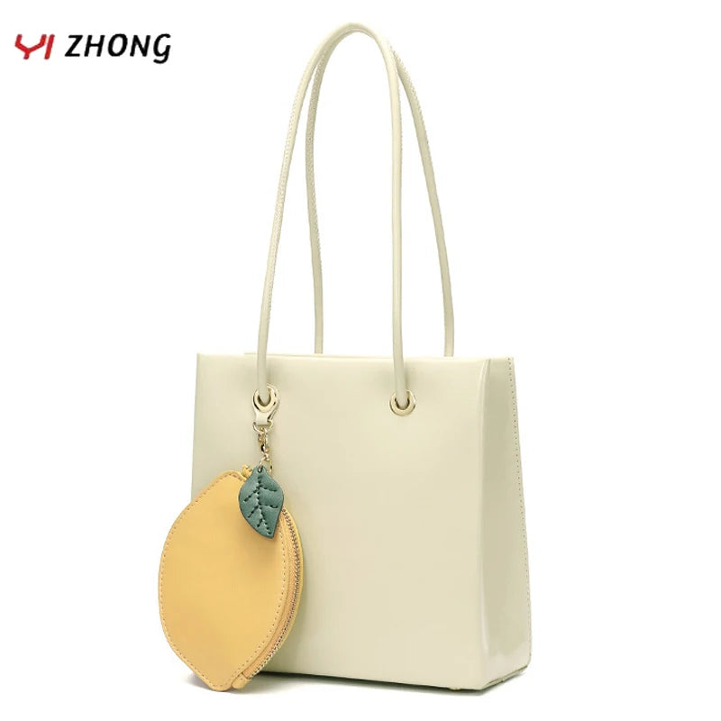 This women's bag features a lemon shape design with a large capacity square bag and a lipstick bag. Made of soft leather, it offers both style and functionality.