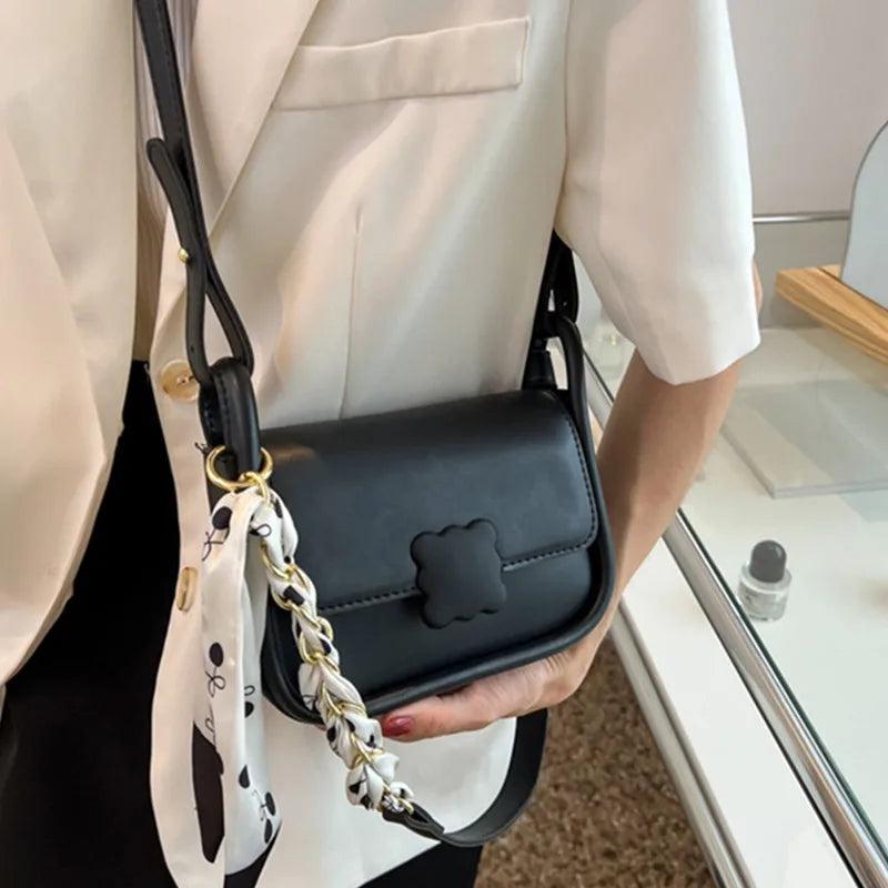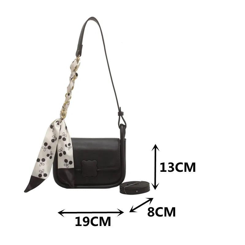 This messenger bag for women is crafted from soft leather and features a stylish chain strap, silk scarf decoration, and a versatile crossbody design.