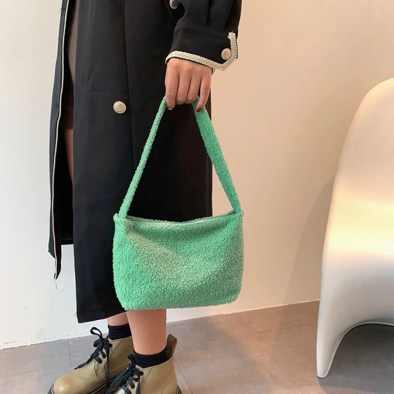 Stay warm and fashionable with this soft plush shoulder bag hobo. This furry ladies clutch purse is perfect for winter. It can also be used as an underarm bag.