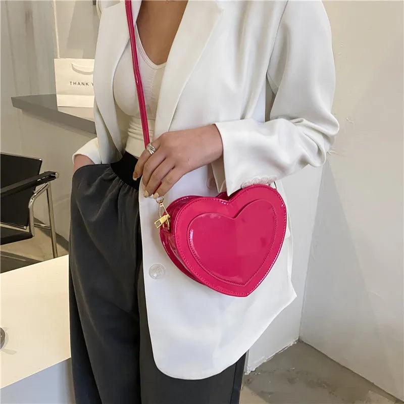 This stylish crossbody bag is made of bright patent leather, perfect for any fashionable lady. It features a heart-shaped design and is ideal for carrying your essentials.
