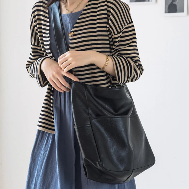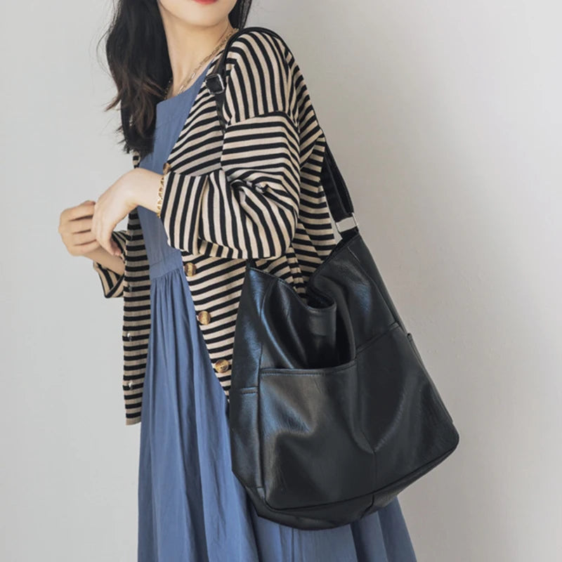 This classic vintage bucket bag is made of high-quality PU soft leather, featuring a large capacity for all your essentials. It can be worn as a cross-body or shoulder bag for versatile styling options.