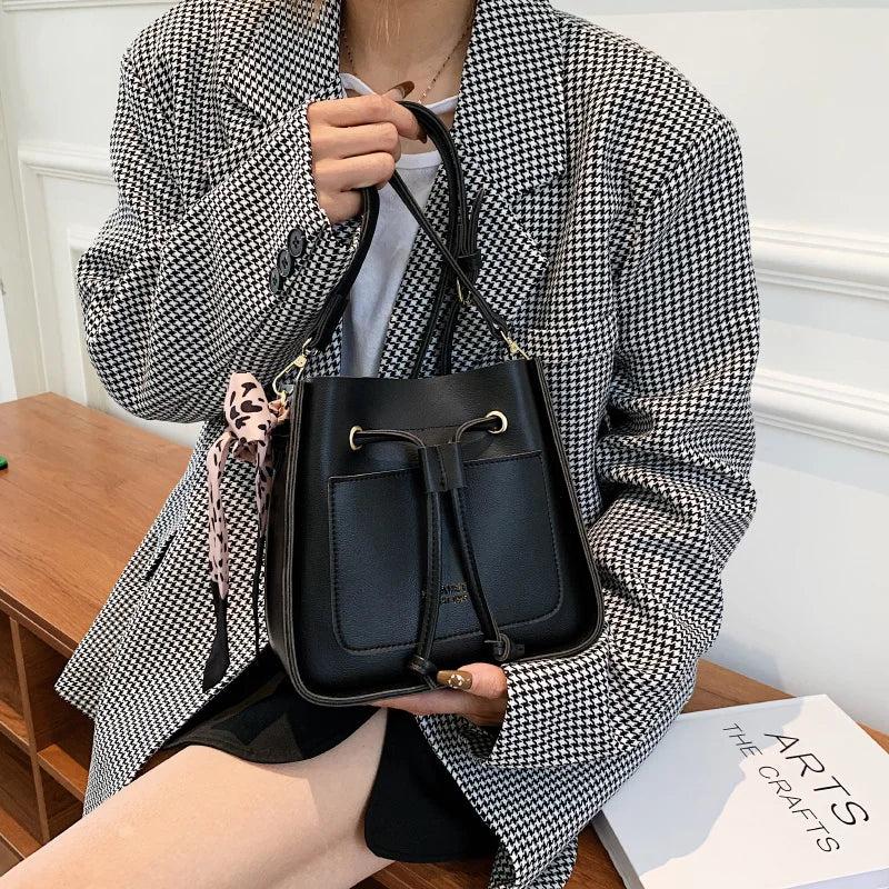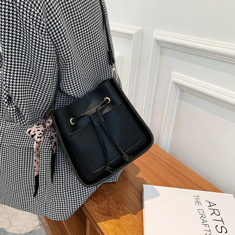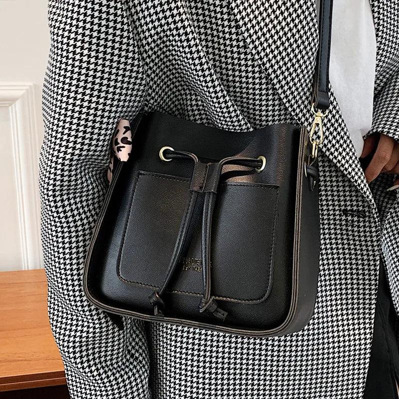 Square Bucket Bag Women PU Leather Crossbody Handbag Drawstring Shoulder
