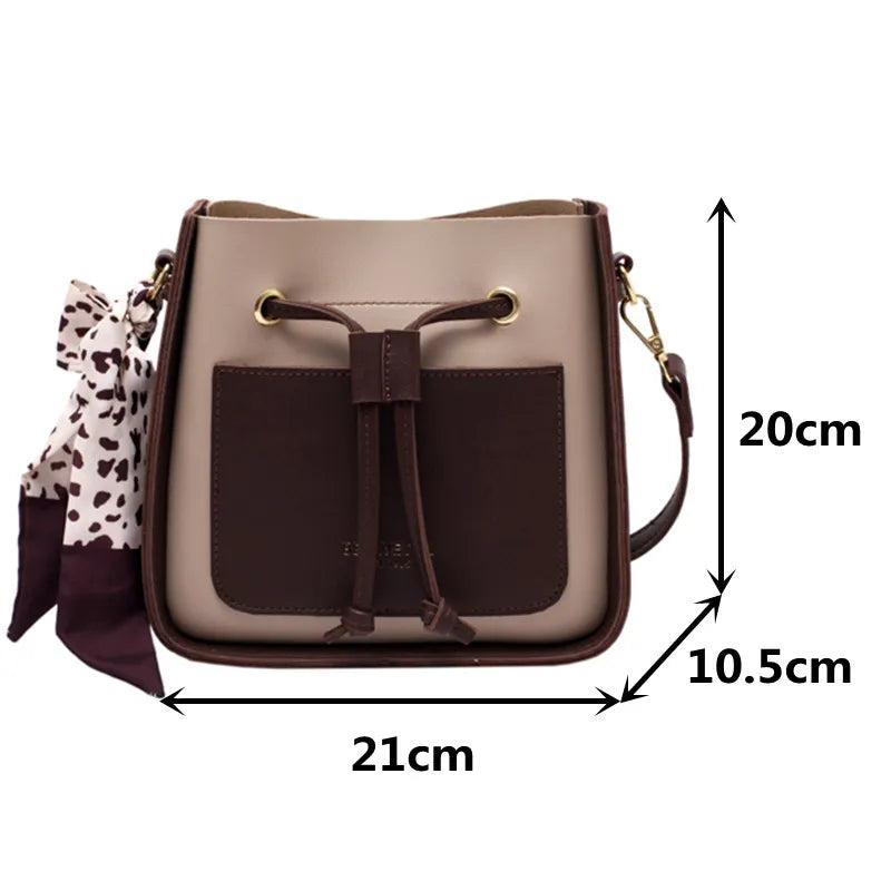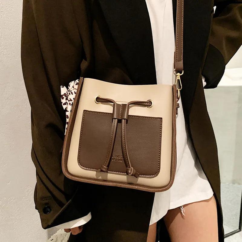 This small square bucket bag is made of high-quality PU leather, perfect for women who love retro style. It features a drawstring closure and can be carried as a crossbody or shoulder bag.