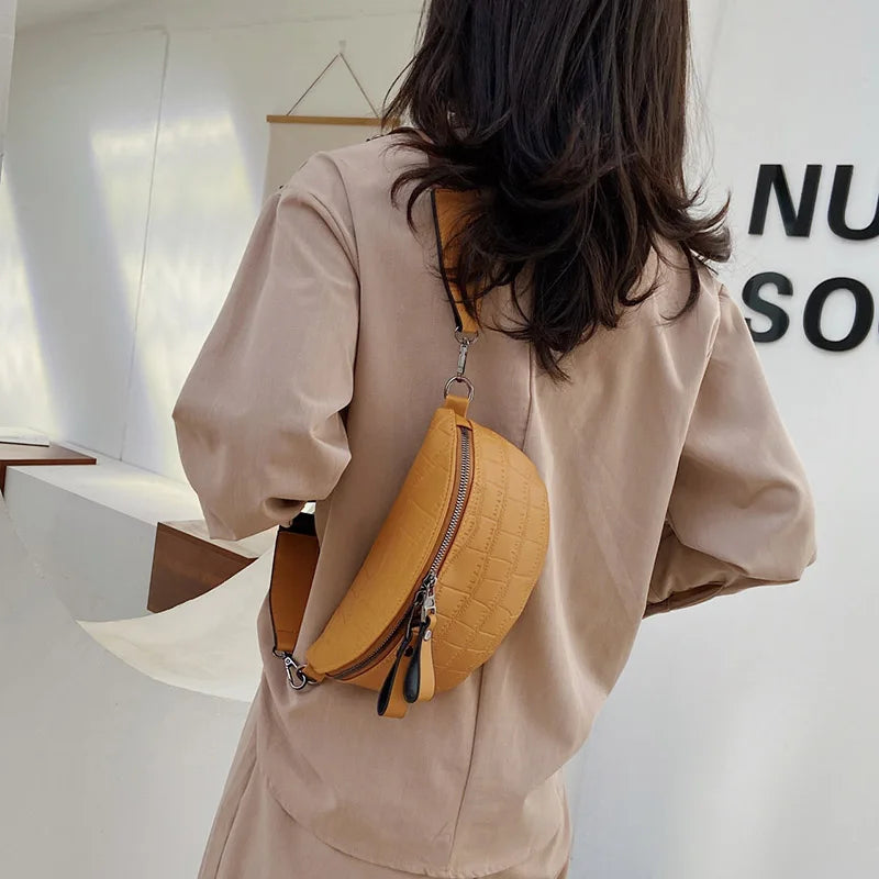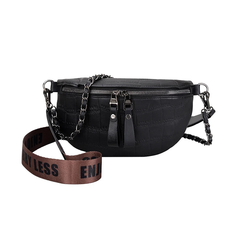 This stylish waist bag is perfect for women on the go. It features a stone pattern design and comes with a chain strap for a trendy look.