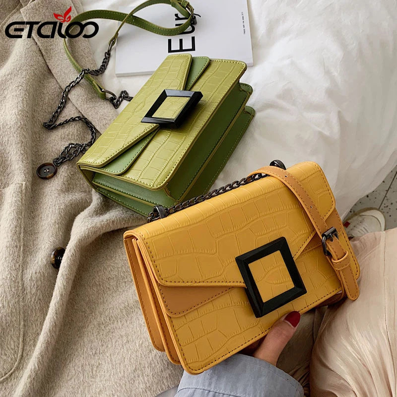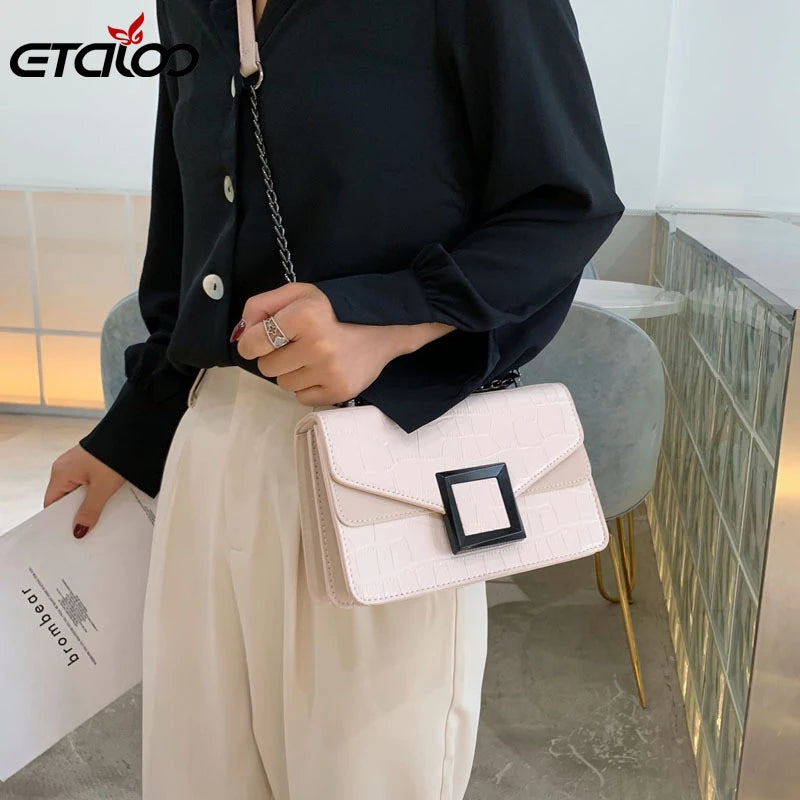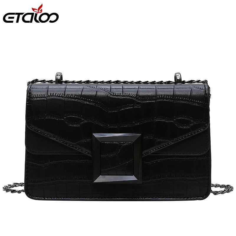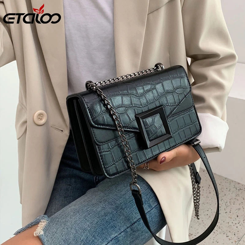 Elegant stone pattern PU leather crossbody bag perfect for women. Chain strap, small size, ideal for everyday use.