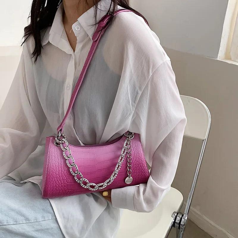 This women's chain axillary bag is made of high-quality PU leather with a stone pattern design. It can be used as an evening clutch or a shoulder bag.