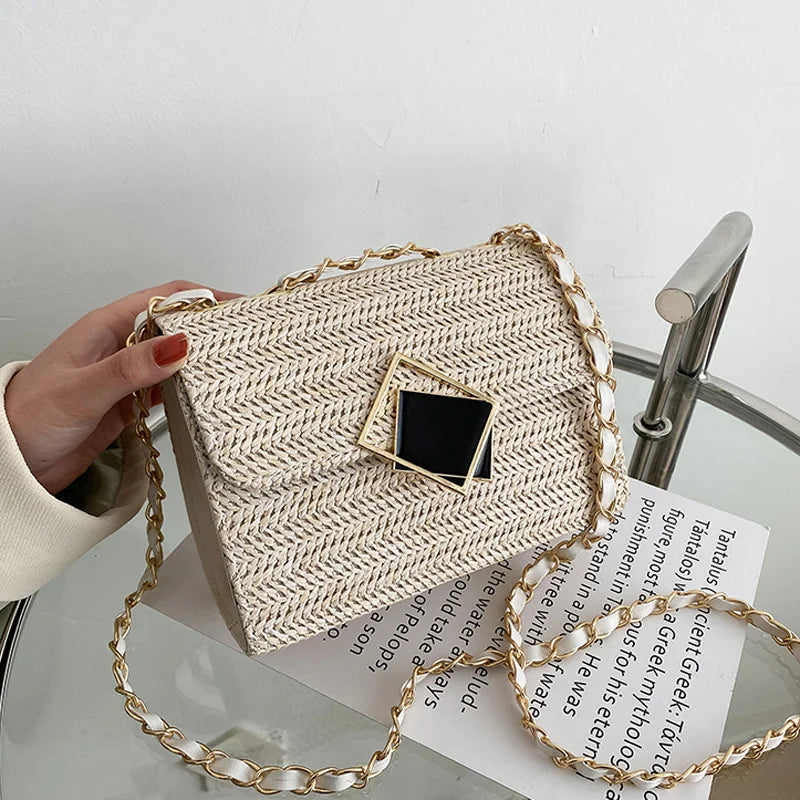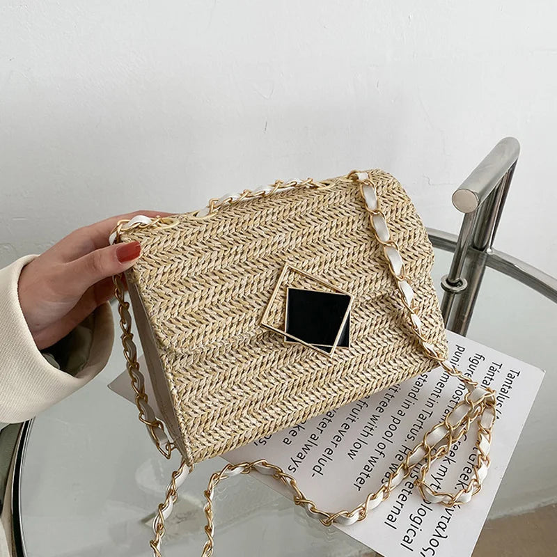 Stay stylish on your summer vacation with this straw shoulder bag. Perfect for casual outings, this crossbody bag features a trendy chain strap for a chic look.