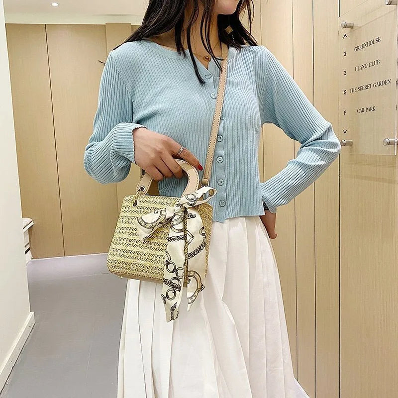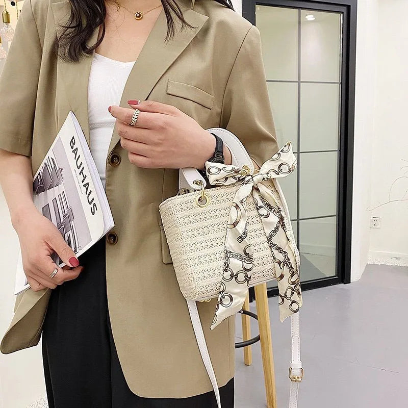 Elevate your summer style with this versatile straw shoulder bag featuring a leather handle. Perfect for a day at the beach or casual outings.