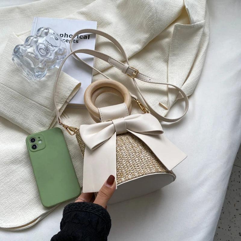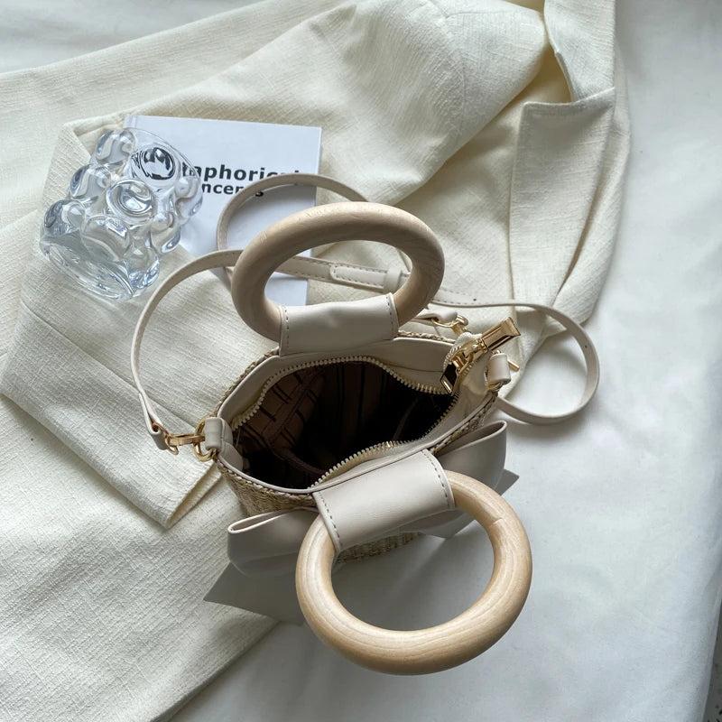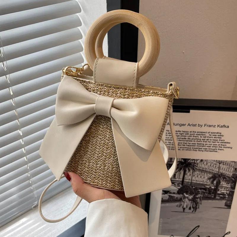 Get ready for summer with this stylish straw shoulder bag featuring a bowknot round wooden handle. Perfect for the beach or everyday use.