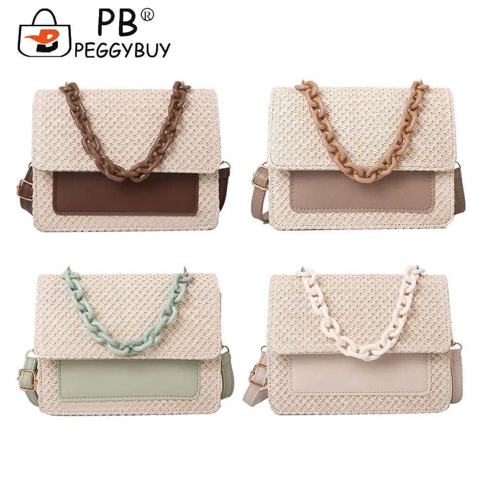 Straw Women Shoulder Messenger Bag Acrylic Chain for Shopping Leisure
