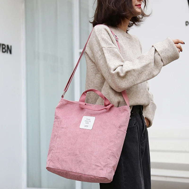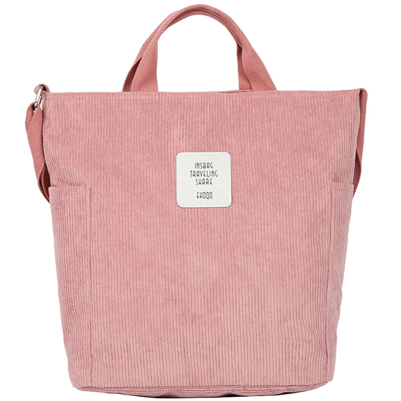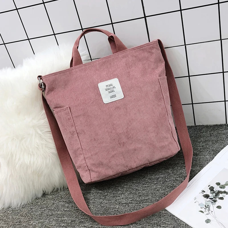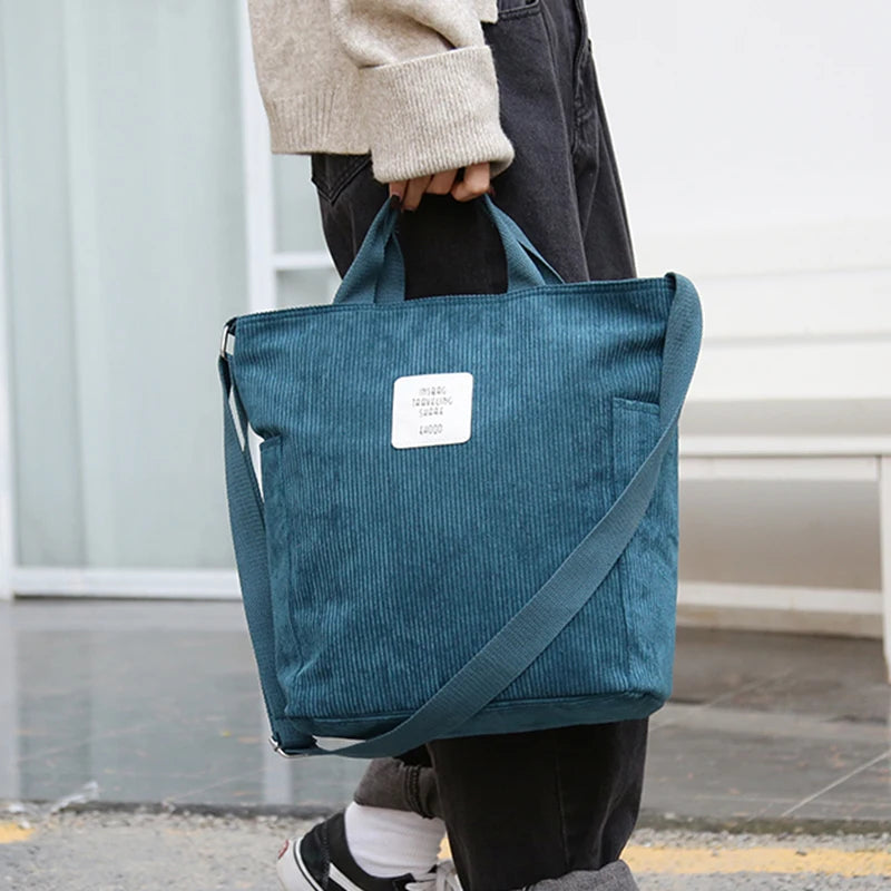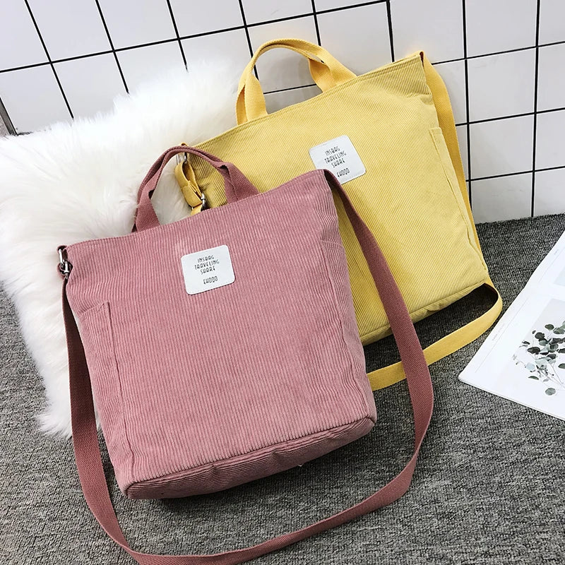 This stylish bag is made of durable corduroy and canvas, featuring a zipper closure for security. It is perfect for college girls to carry books and essentials.