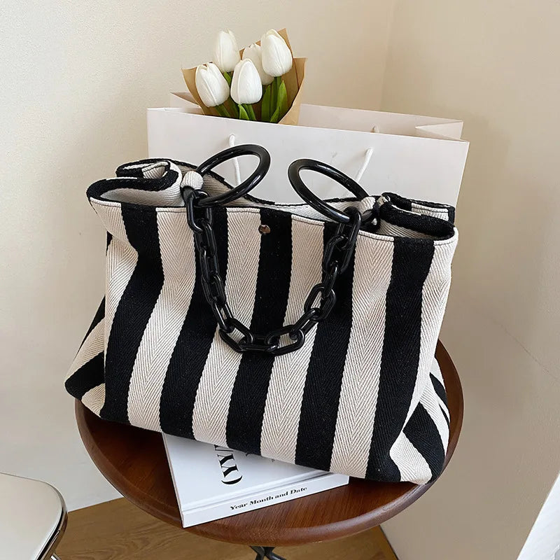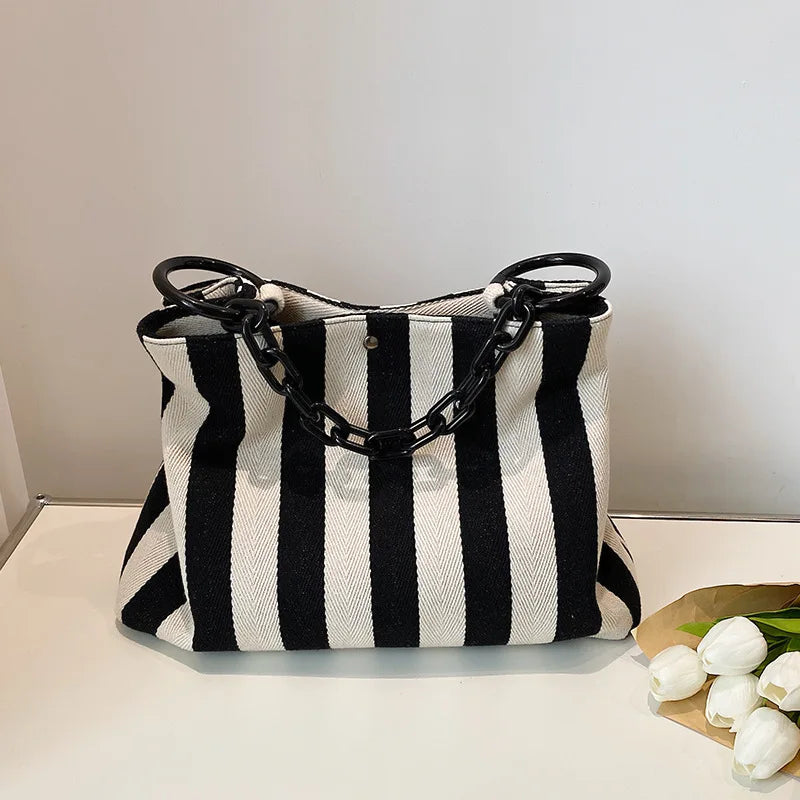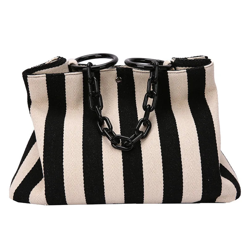 Stripes Canvas Shoulder Bag Women Tote Female Handbags