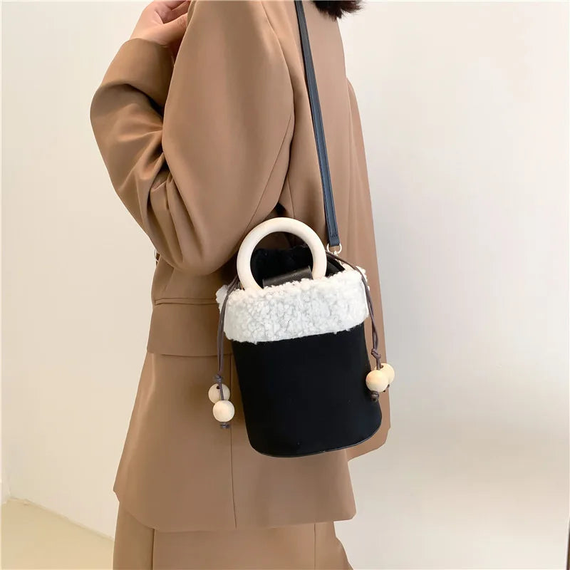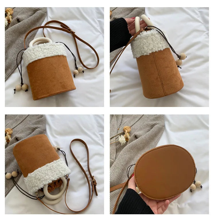 Suede Lambswool Shoulder Bag Wooden Handle Crossbody Bucket Sac