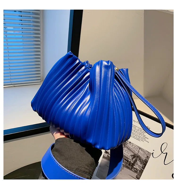 Stay fashionable with this small bucket shoulder bag featuring pleats, perfect for summer outings. It can be used as a handbag, crossbody bag, or tote, adding style to any outfit.