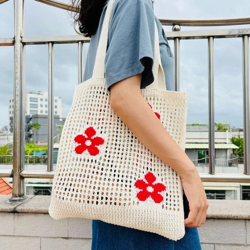 Stay stylish with this handbag featuring a summer flower design. The knitted construction adds texture and charm to your look. Perfect for carrying your essentials while shopping or running errands.