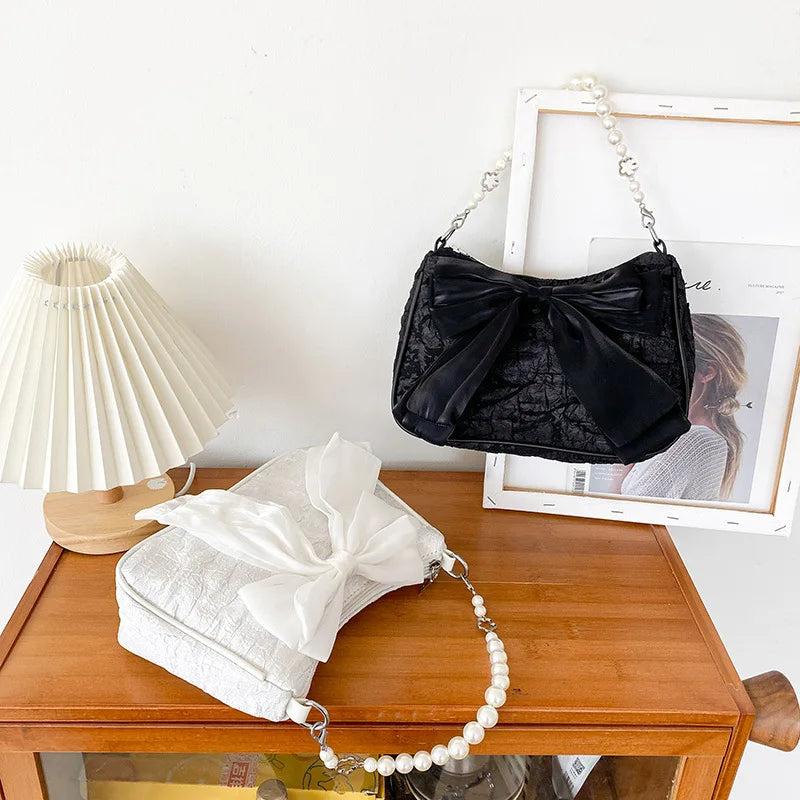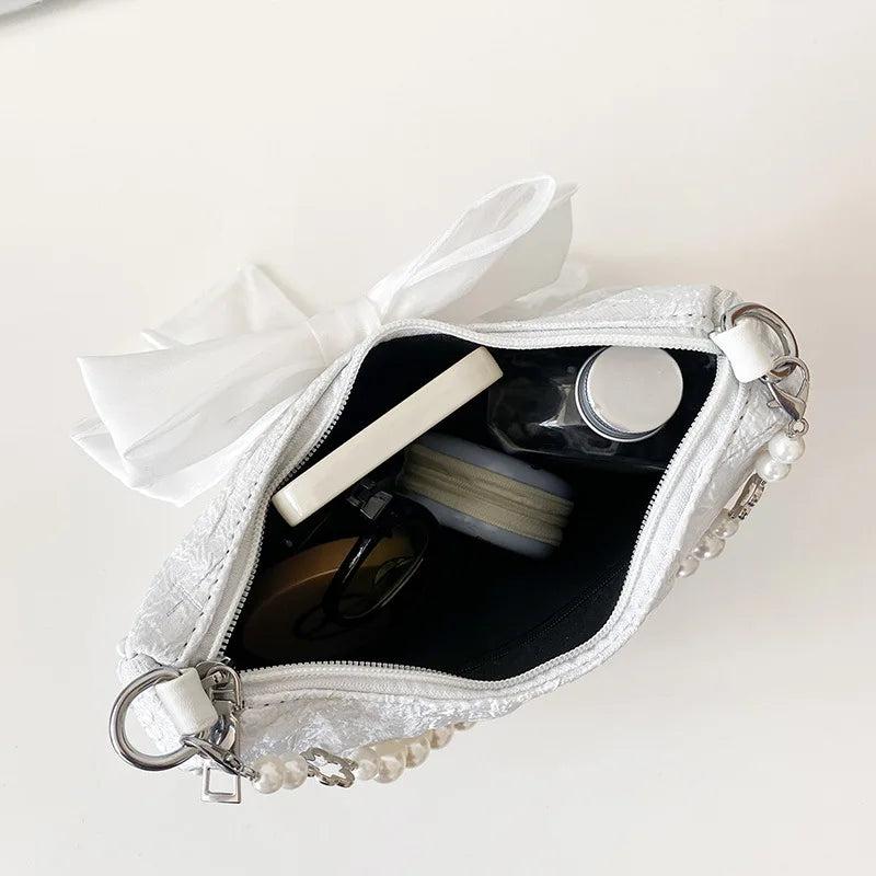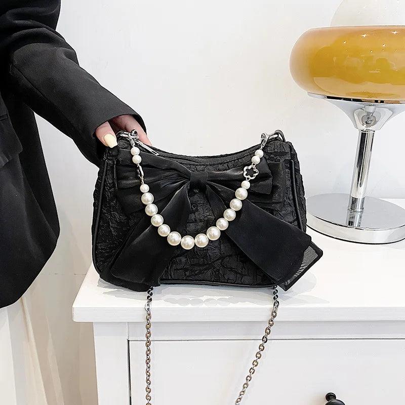 Elegant and stylish shoulder bag featuring pearls chains, perfect for summer. This small flap crossbody bag is ideal for carrying essentials. Can be used as a purse, messenger bag, or handbag pouch.