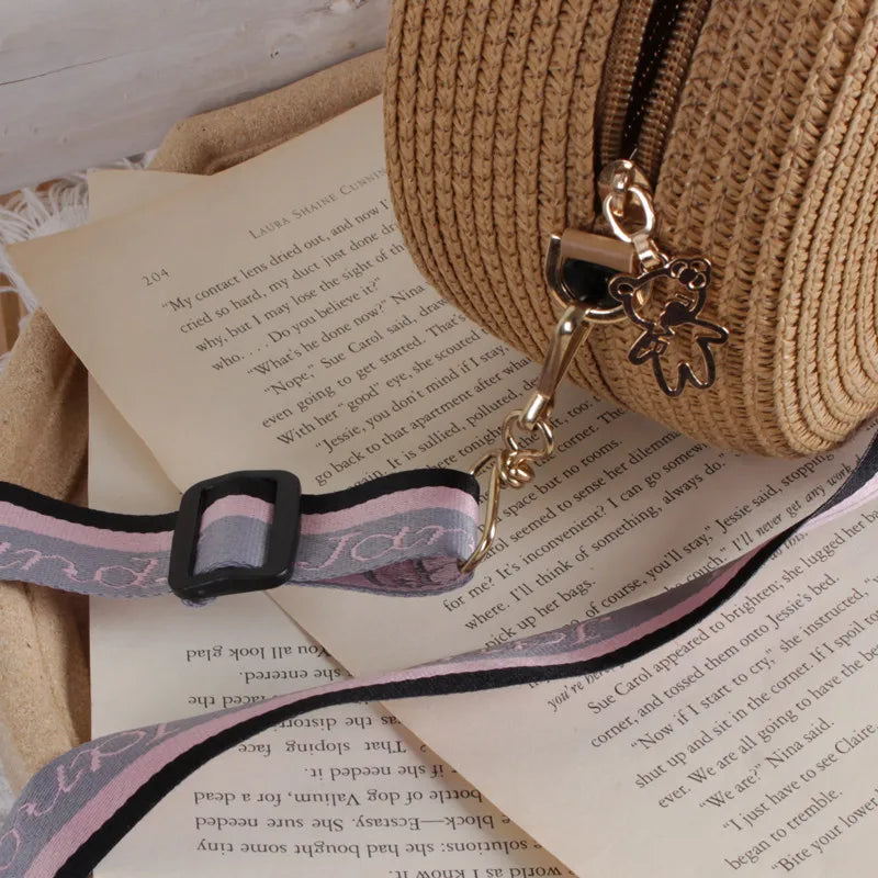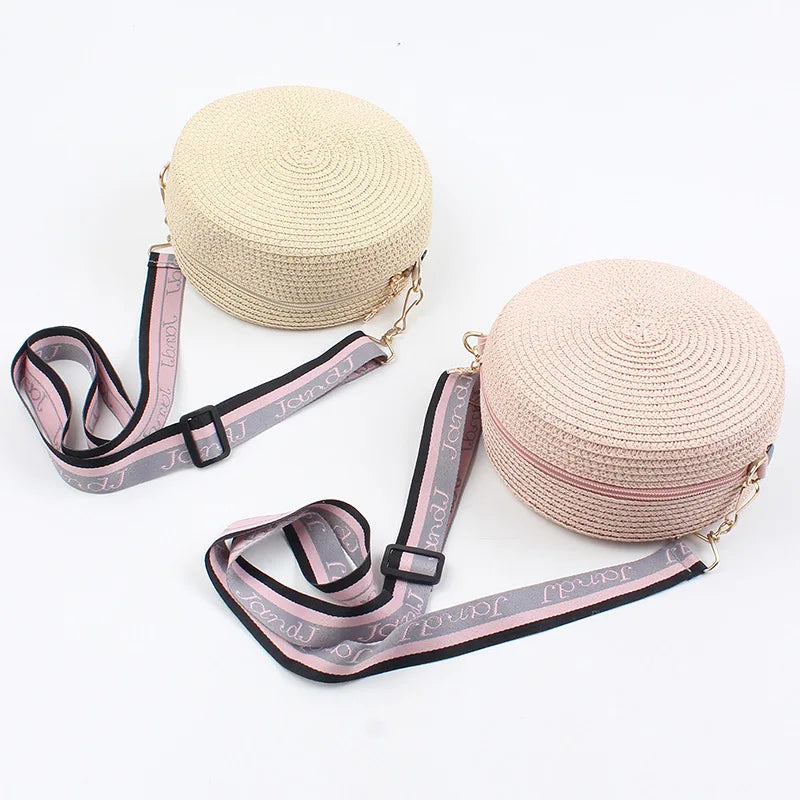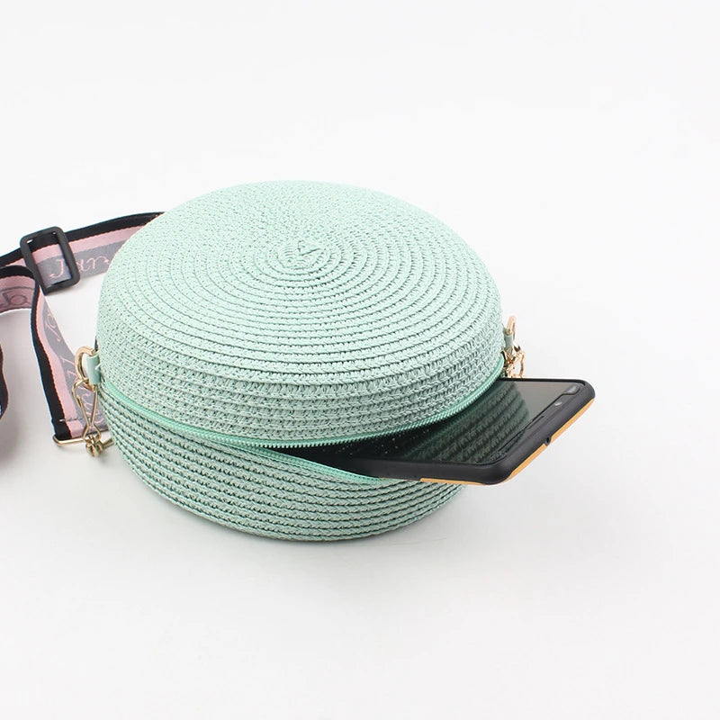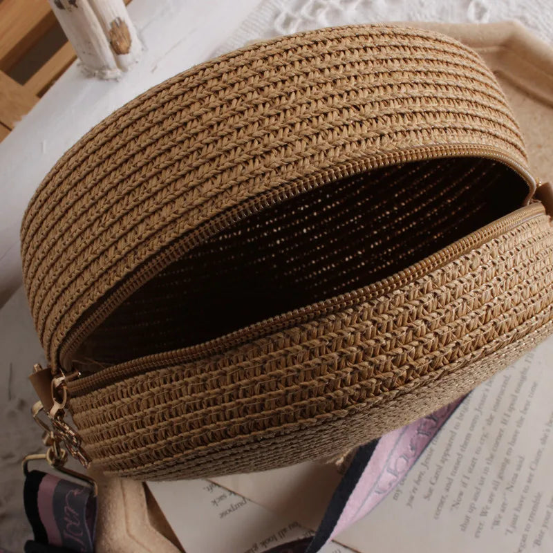 This stylish round crossbody bag is perfect for summer outings. Made of woven straw material with a retro knitted design, it features a zipper closure and a mini size that is ideal for carrying your essentials.