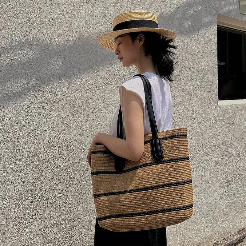 Get ready for summer with this stylish straw tote bag featuring a striped design. It offers a spacious interior, perfect for carrying all your essentials to the beach or on a casual outing.