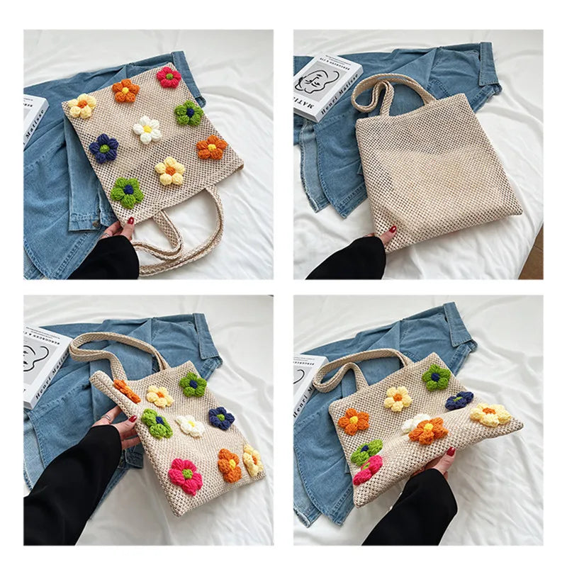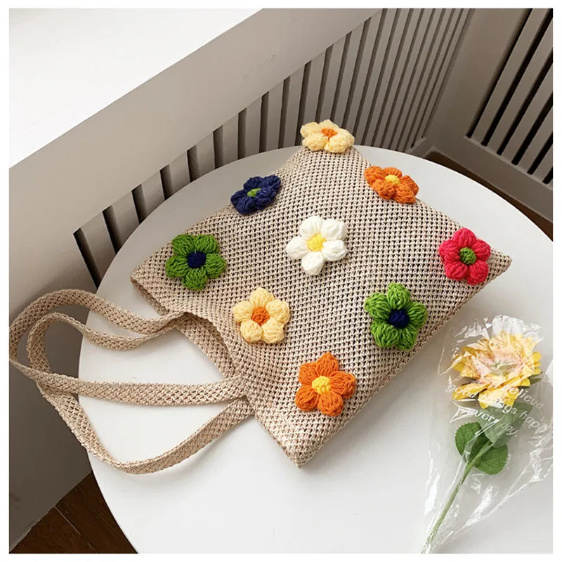 Elevate your summer style with this fashionable straw shoulder bag featuring a lovely floral design. Perfect for beach days or casual outings.