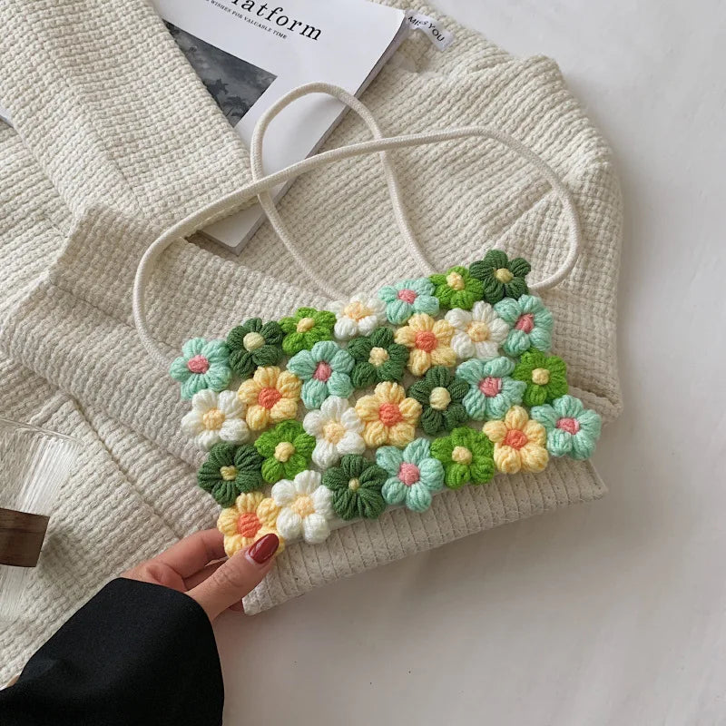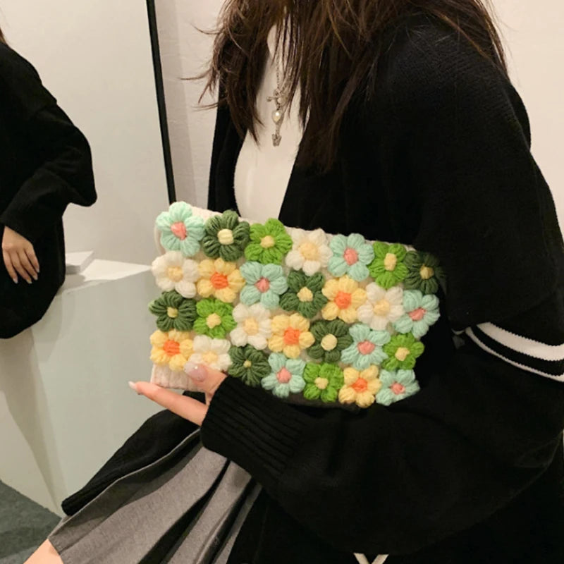 This stylish flap crossbody bag is perfect for summer outings. It's a small square messenger bag purse with a beautiful woven flower design.
