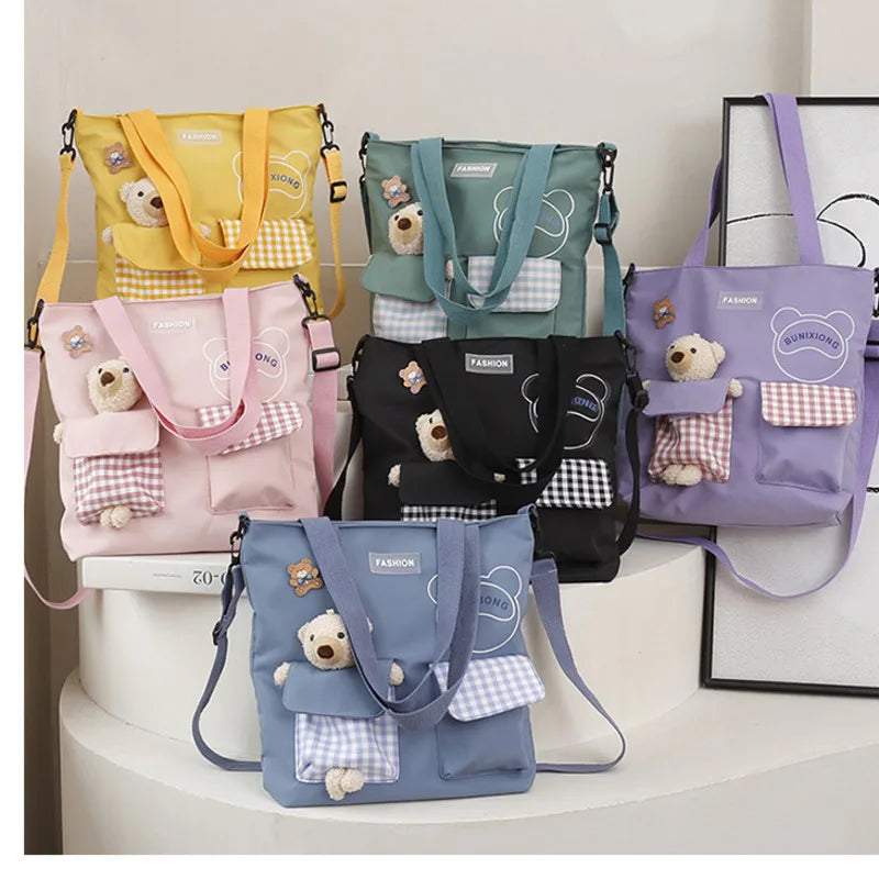 This women's bag is perfect for carrying your essentials with its large capacity. Made of durable nylon fabric, it features a sweet bear design for a charming touch.