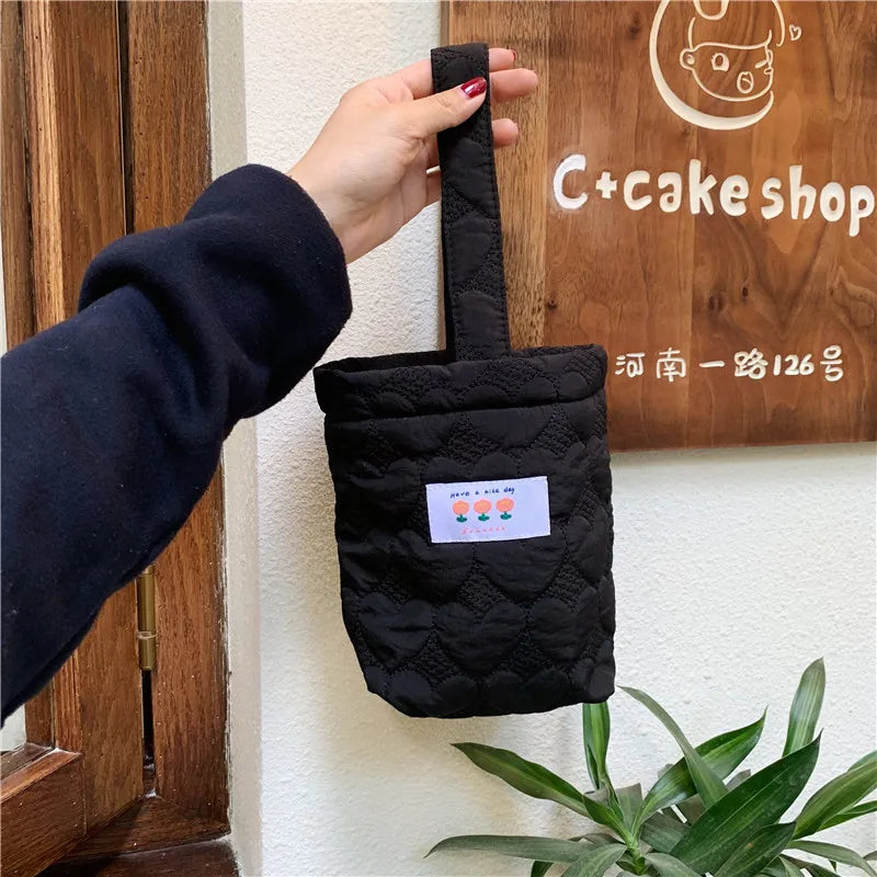 This hand-carry bucket bag is a chic accessory for women. It features a sweet love quilted design, perfect for students or girls. The bag can hold water bottles and other essentials.