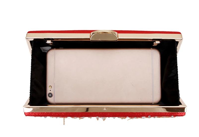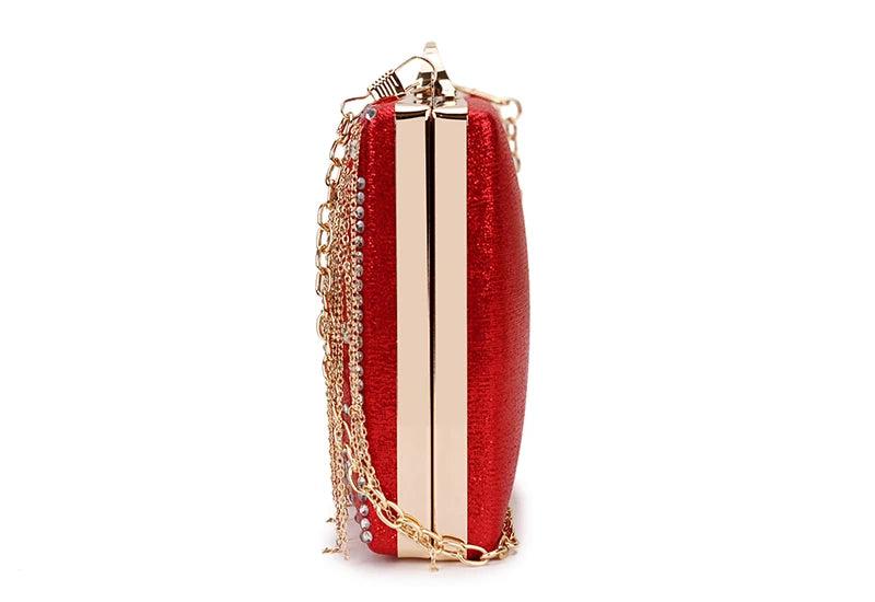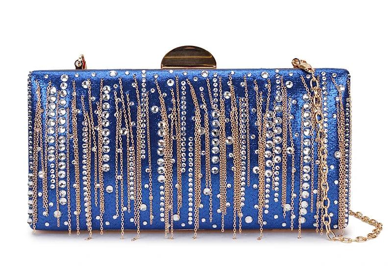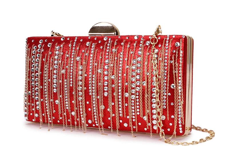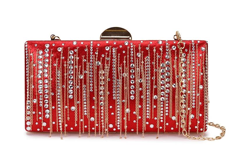 This stylish evening bag can be used as a clutch, shoulder bag, or crossbody purse. It features a tassel and diamond design, perfect for parties and special occasions.