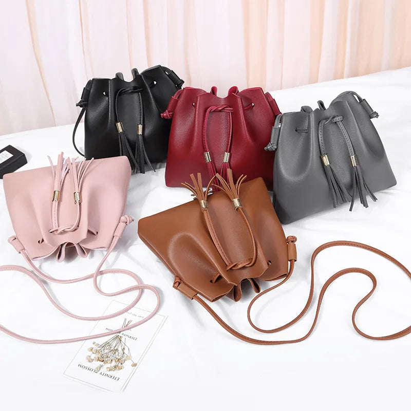 Tassel PU Leather Bucket Bag Small Handbag Women Shoulder Crossbody Purse