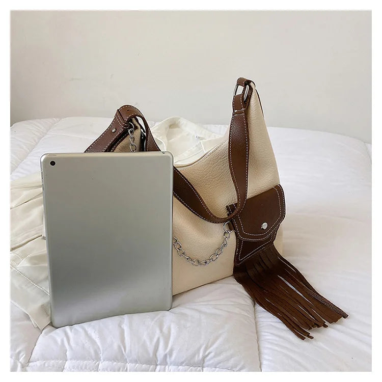 Elegant and stylish shoulder bag with tassels and chain design, made of high-quality PU leather. Features a large capacity for all your essentials.